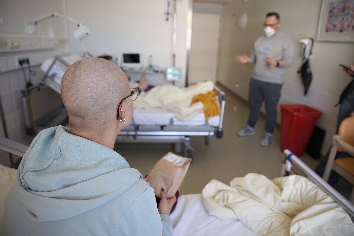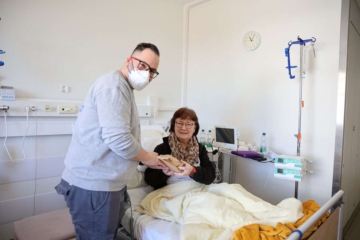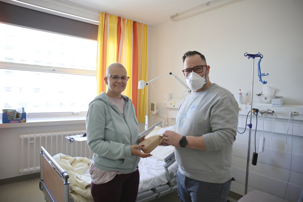 David Diehl weiß aus eigener Erfahrung, wie wichtig solche Gesten sind. Der 44-Jährige war selbst Patient am UniversitätsKrebszentrum Göttingen, wo er 2018 mit Lymphdrüsenkrebs behandelt wurde. Seit Dezember 2021 engagiert er sich als Pate des Eisvogel e.V. und besucht die UMG regelmäßig zu Ostern und Weihnachten, um Patient*innen auf den onkologischen Stationen zu unterstützen und Mutmacher-Pakete zu überreichen. Im persönlichen Austausch gibt er seine Erfahrungen weiter und möchte Betroffenen Zuversicht vermitteln.