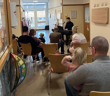 Im Anschluss haben die Laufbuddies, die die selbst gestalteten T-Shirts der Kinder beim Lauf getragen haben, den kleinen Patient*innen einen Besuch abgestattet und ihnen Polaroid-Fotos von sich im Shirt als Erinnerung übergeben. Zudem gab es Pizza und frisches Obst, dass die UMG Gastronomie gespendet hat. Als besonderes Highlight für die Kinder gab es am Nachmittag ein Flurkonzert mit Sänger und Pianist, Kilian Recknagel. Bei einigen Liedern wurde sogar getanzt.