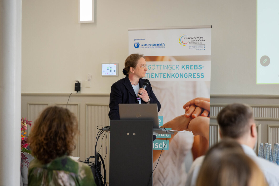 Rund 350 Teilnehmende, 100 mehr als beim letzten Patientenkongress in 2024, nutzten die Gelegenheit, sich bei der diesjährigen Veranstaltung auszutauschen, Wissen zu vertiefen und Kontakte zu knüpfen. Im Fokus standen allgemeinverständliche Vorträge zu aktuellen Entwicklungen in der Onkologie, unter anderem zu Lungen-, Darm- und Brustkrebs, personalisierter Medizin sowie zu unterstützenden Angeboten wie zur Psychoonkologie, Ernährung, Sport und Hautpflege. Erstmals wurde das Programm durch eine Podiumsdiskussion zur Bedeutung der Krebsforschung ergänzt. Zudem gab es wie beim letzten Mal Erfahrungsberichte und Beiträge von Selbsthilfeorganisationen. Die Resonanz der Teilnehmenden, Ausstellenden und Referierenden war durchweg positiv. „Der große Zuspruch zeigt, wie wichtig es ist, einen Raum für Begegnungen zwischen Betroffenen, Angehörigen und Behandelnden zu schaffen“, so Prof. Dr. Braulke, Geschäftsführerin des UniversitätsKrebszentrums Göttingen. „Solche Formate stärken nicht nur die Vernetzung, sondern geben Patientinnen und Patienten sowie Angehörigen wichtige Orientierung und Sicherheit bei der Suche nach verlässlichen Informationen.“ Besonders geschätzt wurde das offene, freundliche Ambiente, die persönliche Ansprechbarkeit der Referierenden und die Möglichkeit, direkt ins Gespräch zu kommen. Die Veranstaltung bot wertvolle Impulse und Raum für den intensiven Austausch miteinander.